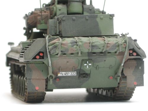 Unterwanne und Laufwerke verlängert. Verlängerung der Auspuffrippen. Anpassung aller Details im Eigenbau. Kettenpolster von RN Modellbau. Aufbauten am Turm geändert. Umbau der 35 mm MK.