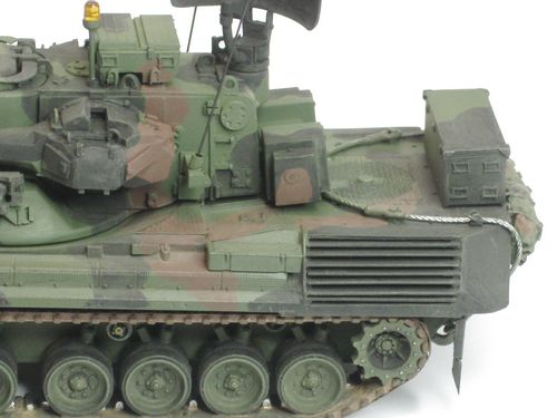 Unterwanne und Laufwerke verlängert. Verlängerung der Auspuffrippen. Anpassung aller Details im Eigenbau. Kettenpolster von RN Modellbau. Aufbauten am Turm geändert. Umbau der 35 mm MK.