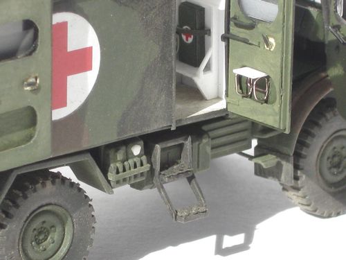 Eigenbau des Sanitätskoffers samt Inneneinrichtung aus Evergreen Styreneteilen und Profilen. Umbau der Dachaufbauten (Abweiser, Dachluken). Viele Ergänzungen angebracht. Änderungen am Fahrwerk. Lackierung Revell Matt 65 mittels Airbrush. Nato Tarnung lt. Tarnplan der Bundeswehr. Weathering mit Ölfarben und Pigmenten von MIG. Decals von TL.
