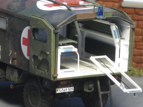 Eigenbau des Sanitätskoffers samt Inneneinrichtung aus Evergreen Styreneteilen und Profilen. Umbau der Dachaufbauten (Abweiser, Dachluken). Viele Ergänzungen angebracht. Änderungen am Fahrwerk. Lackierung Revell Matt 65 mittels Airbrush. Nato Tarnung lt. Tarnplan der Bundeswehr. Weathering mit Ölfarben und Pigmenten von MIG. Decals von TL.