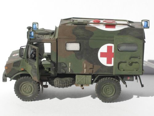 Eigenbau des Sanitätskoffers samt Inneneinrichtung aus Evergreen Styreneteilen und Profilen. Umbau der Dachaufbauten (Abweiser, Dachluken). Viele Ergänzungen angebracht. Änderungen am Fahrwerk. Lackierung Revell Matt 65 mittels Airbrush. Nato Tarnung lt. Tarnplan der Bundeswehr. Weathering mit Ölfarben und Pigmenten von MIG. Decals von TL.