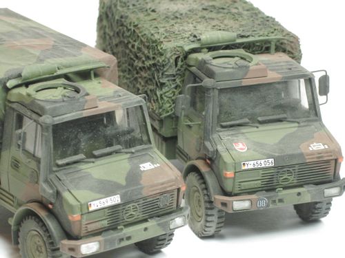 Einige Ergänzungen angebracht. Plane aus Folie aufgebaut. Änderungen am Fahrwerk und der Anbauteile. Eigenbau der Tarnnetzhalterung, Auftritte geändert.