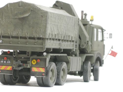 Eigenbau des Fahrwerks und sämtlicher Aufbauten. Pritsche und Plane stammen aus einem Preiser Bausatz. Decals von TL. Lackierung mit Revell Matt 46 mittels Airbrush. Weathering mit Pastellkreiden.