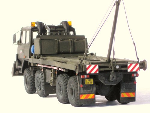 Einige Gitter am Pontontransporter wurden durch Ätzteile ersetzt. Eigenbau der Hebeeinrichtung und Darstellung der Zugseile aus gedrillter Kabellitze. Der Mittelponton stammt von SMK (Resin). Anbau der BZ-815 Räumschaufel von JMPK (87054) . Etliche Ergänzungen und Änderungen an Fahrwerk und Aufbauten notwendig. Rundumkennleuchten von Minitanks. Eigenbau des Fahrzeug Hecks und der rückw. Beleuchtungsanlage. Decals wurden teilweise selbst erstellt. Lackierung mit Airbrush überwiegend mit Revell Farben. Sehr zurückhaltendes Weathering mit Ölfarben und Pigmenten von MIG.