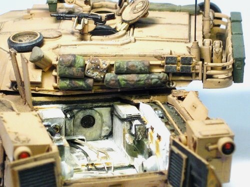 Kompletter Umbau des Fahrzeughecks und Einbau der Motorraumteile aus den MR conversations kit. Einige spezifische Details ergänzt – zum Beispiel wurden die Maschinengewehre auf dem Turm gründlich überarbeitet. Ausrüstungsgegenstände aus dem Roco Minitanks- Sortiment. Ätzteilkettenpolster von RN-Modellbau. APU am Heck stammt ebenfalls von MR.