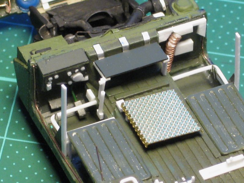 Kompletter Umbau des Roco Modells. Alle Türen geöffnet – Eigenbau des Motors und der Inneneinrichtung. Nato- Dreifarbtarnfarbe mittels Airbrush. Weathering mit Pastellkreiden und Pigmenten. Decals von TL.