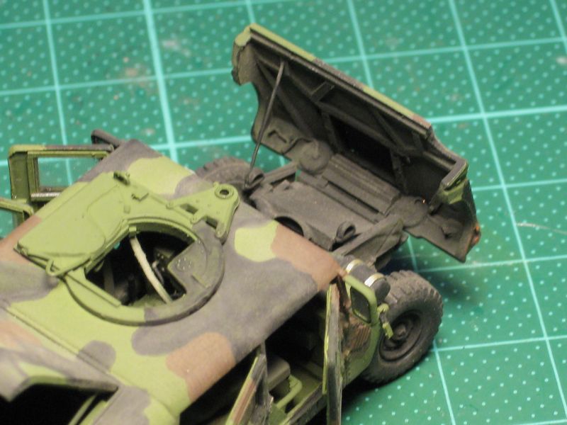 Kompletter Umbau des Roco Modells. Alle Türen geöffnet – Eigenbau des Motors und der Inneneinrichtung. Nato- Dreifarbtarnfarbe mittels Airbrush. Weathering mit Pastellkreiden und Pigmenten. Decals von TL.