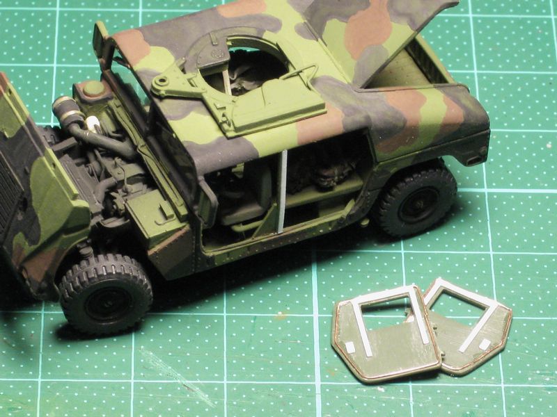 Kompletter Umbau des Roco Modells. Alle Türen geöffnet – Eigenbau des Motors und der Inneneinrichtung. Nato- Dreifarbtarnfarbe mittels Airbrush. Weathering mit Pastellkreiden und Pigmenten. Decals von TL.