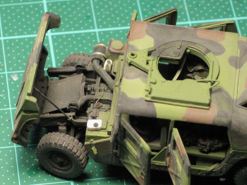 Kompletter Umbau des Roco Modells. Alle Türen geöffnet – Eigenbau des Motors und der Inneneinrichtung. Nato- Dreifarbtarnfarbe mittels Airbrush. Weathering mit Pastellkreiden und Pigmenten. Decals von TL.