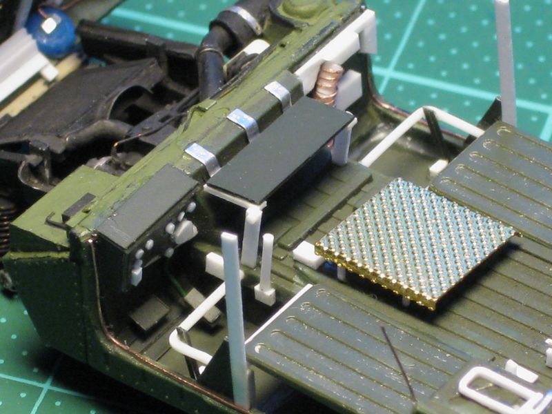 Kompletter Umbau des Roco Modells. Alle Türen geöffnet – Eigenbau des Motors und der Inneneinrichtung. Nato- Dreifarbtarnfarbe mittels Airbrush. Weathering mit Pastellkreiden und Pigmenten. Decals von TL.