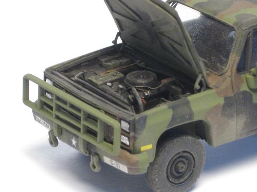 Einige Ergänzungen angebracht. Lackierung mit Airbrush (Humbrol Matt 150) – Tarnschema mit Pinsel laut Tarnplan aufgebracht. Decals von TL. Weathering mit Ölfarben und Pigmenten. Eigenbau des Motorblocks.